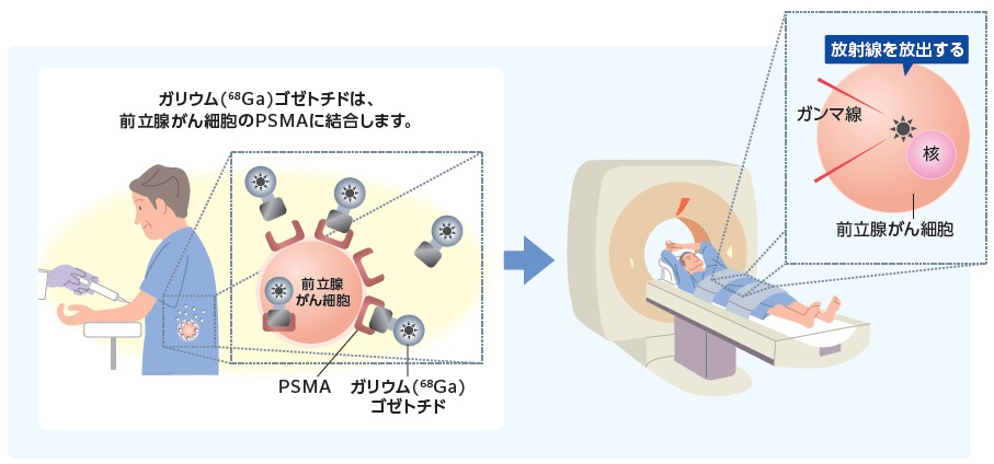 この薬はおもにPSMAを持つ前立腺がん細胞に結合し、結合した近くで放射線(ベータ線)を出してがん細胞を壊します。正常な細胞には結合しにくいため、周囲への影響をできるだけ少なくできると期待されます(まったく影響がないわけではありません)。