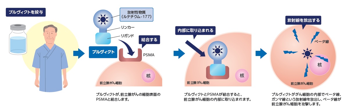プルヴィクトは、前立腺がん細胞の表面に多く見られる目印「PSMA(ピー・エス・エム・エー)」に結合する薬(リガンド)に、放射性物質(ルテチウム-177)が結びついたものです。