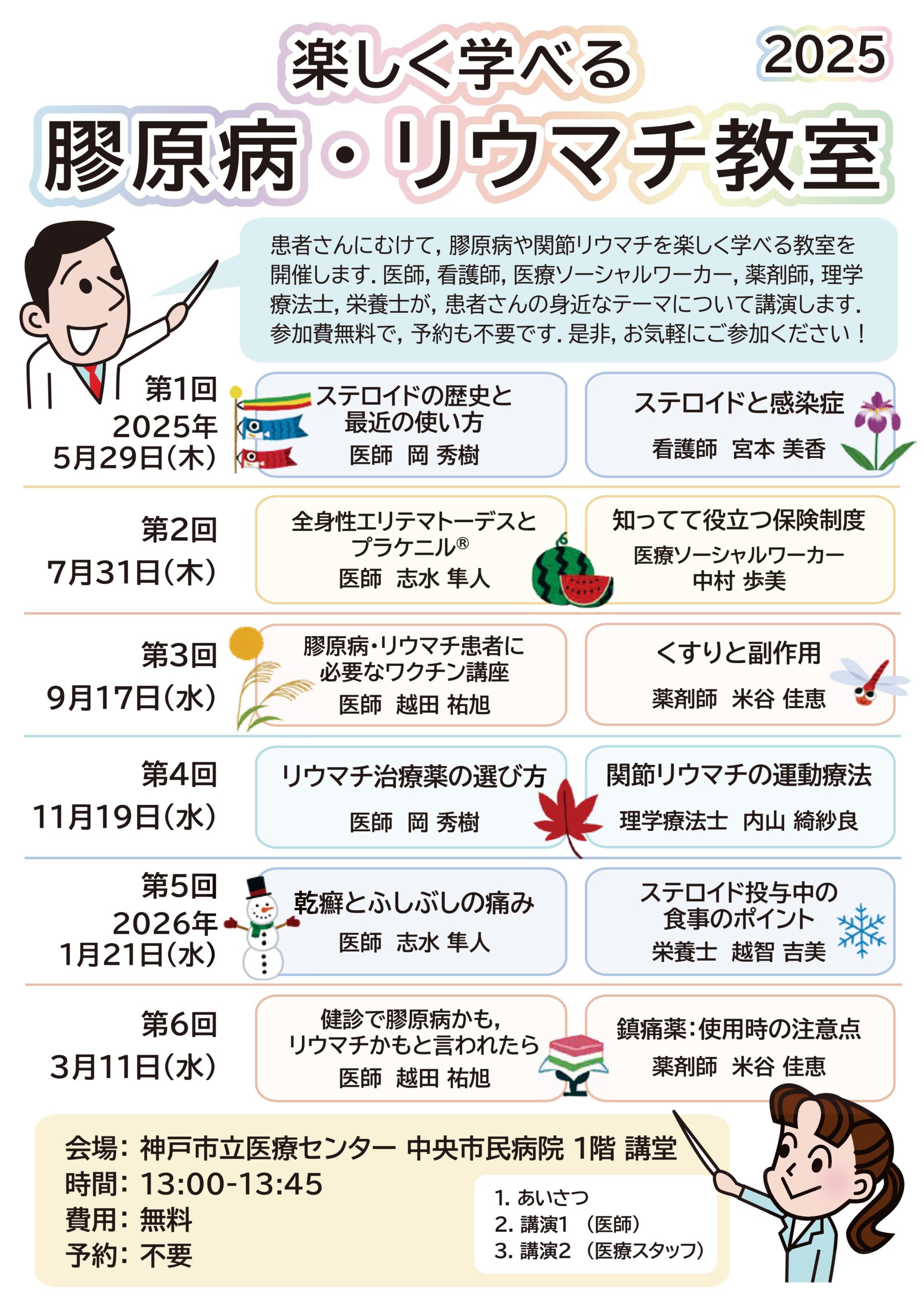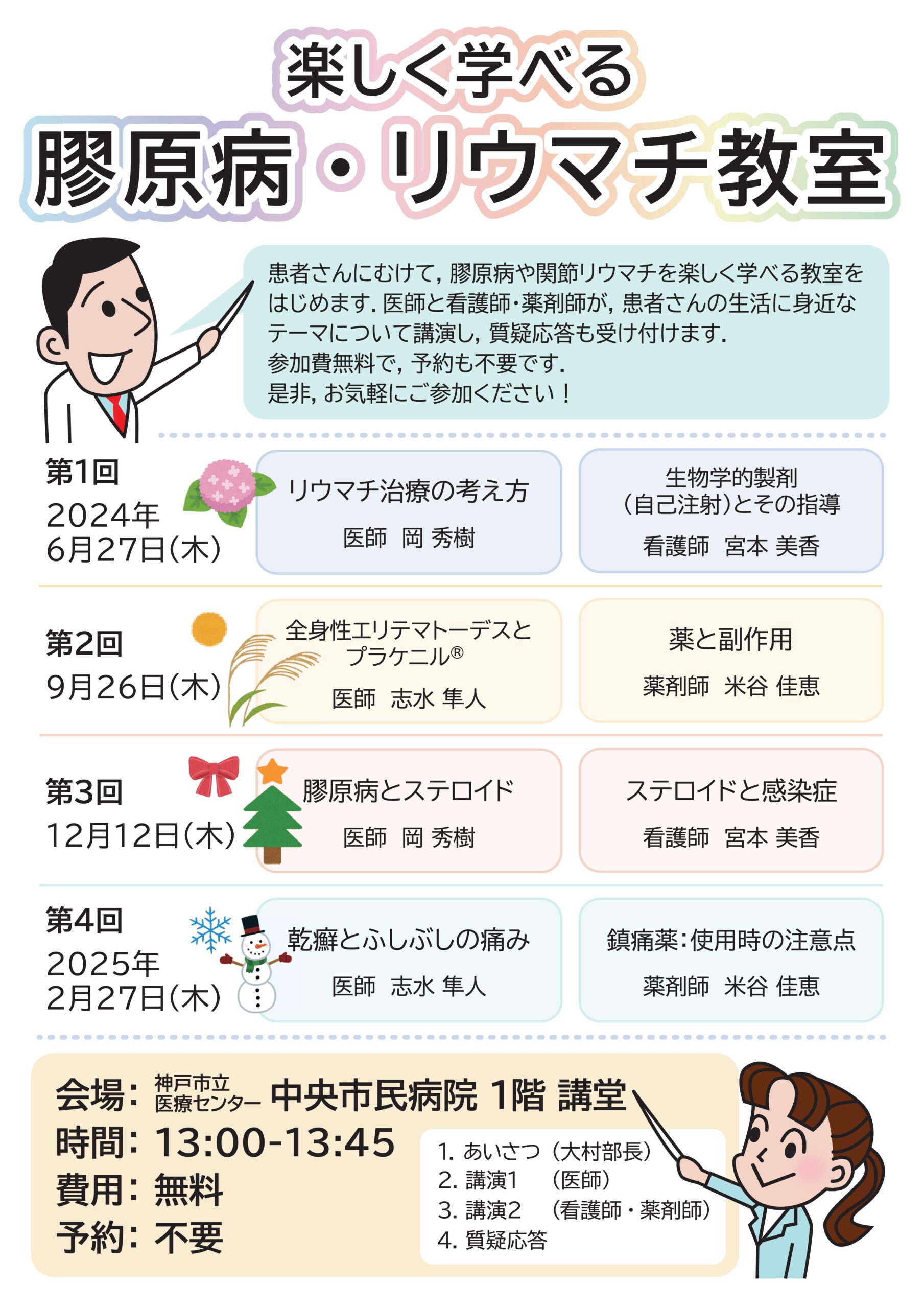 膠原病・リウマチ内科は、令和6年度より、患者さん向けの院内講演会「楽しく学べる膠原病・リウマチ教室」を開催することとなりました。